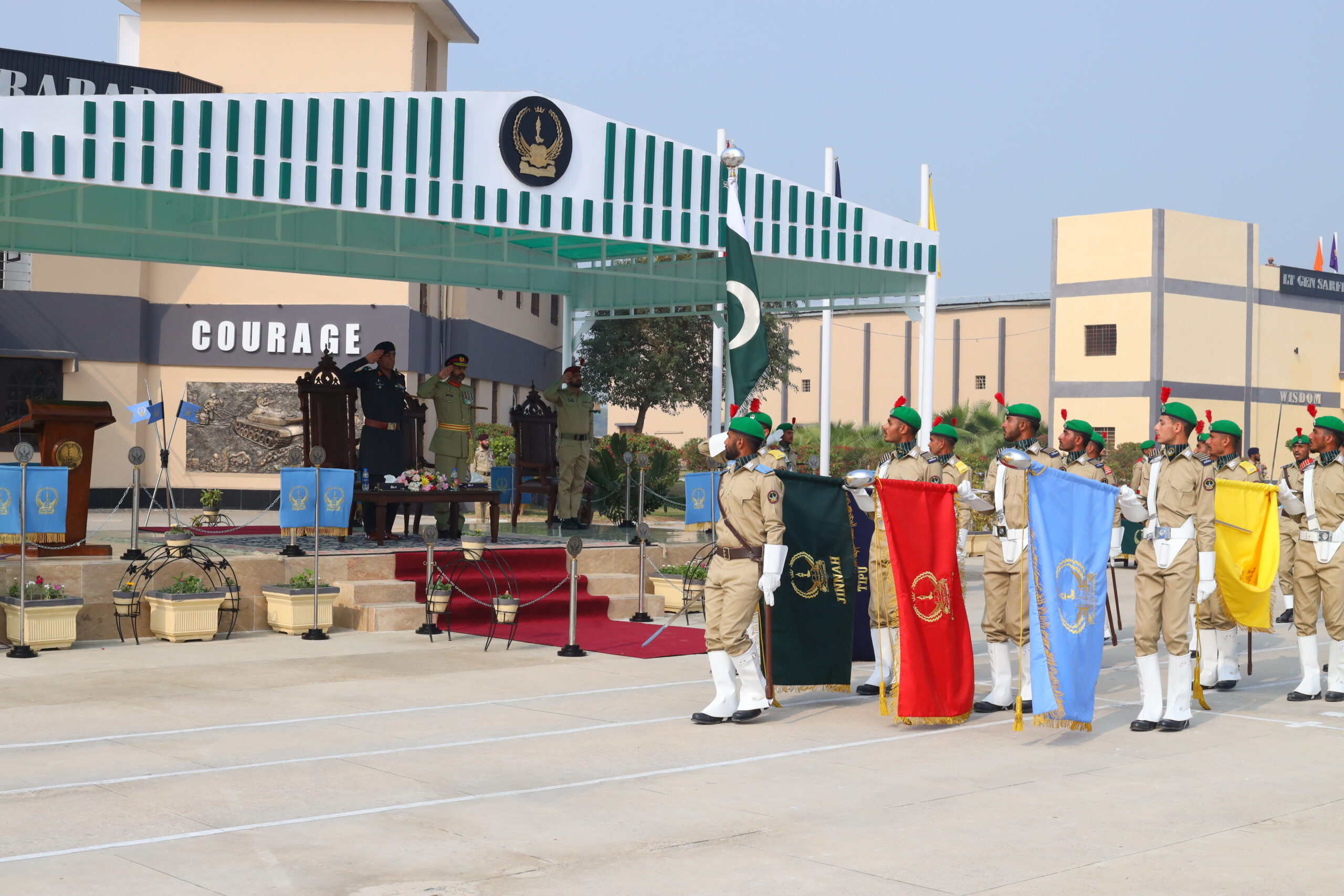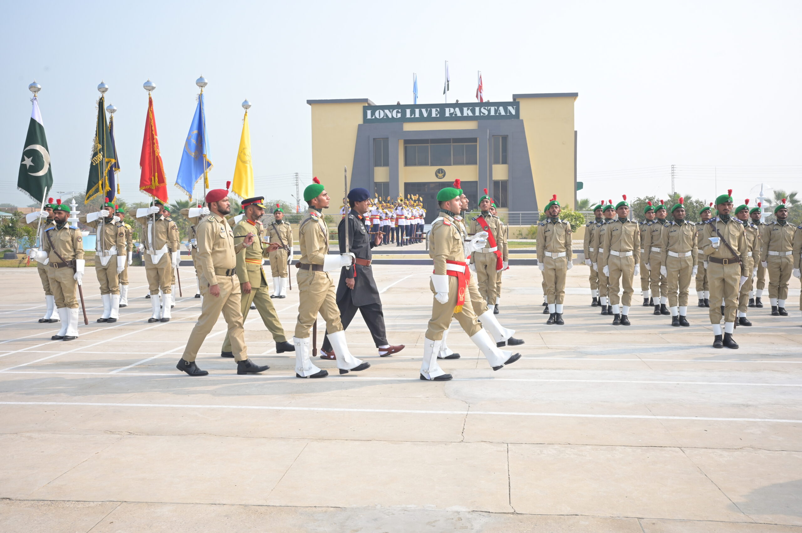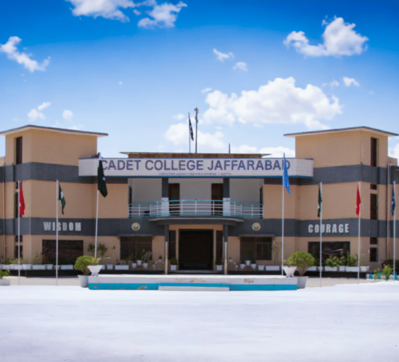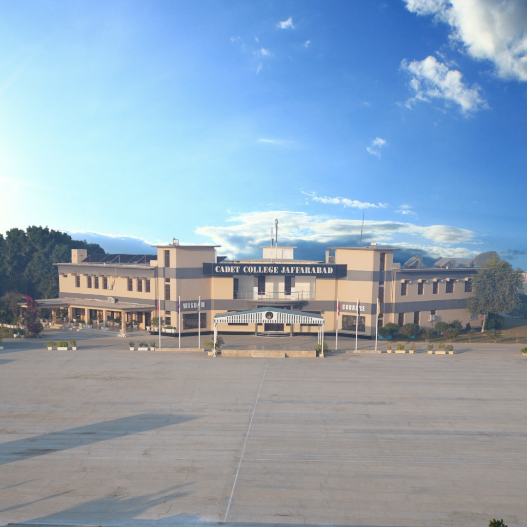 Cadet College Jaffarabad is situated on 100 acres of lush, green land near Usata Muhammad, at the junction of Balochistan and Sindh provinces, close to the Cattle Farm area. Surrounded by vast agricultural fields, the campus provides a peaceful yet structured environment for the academic, physical, and moral grooming of future leaders of Pakistan. The college comprises modern academic blocks, well-equipped science laboratories, administrative offices, residential hostels, playgrounds, and training areas. Its central parade ground serves as the focal point of daily activities, parades, and ceremonial occasions, reflecting unity, discipline, and institutional spirit. Cadet College Jaffarabad was established as part of a national initiative aimed at promoting quality education in the underdeveloped regions of Balochistan. This visionary project was launched under the special guidance of then President General (Retd) Pervez Musharraf, to extend the network of cadet colleges across the province. In the initial phase, three cadet colleges were approved in Balochistan: Cadet College Qila Saifullah, Cadet College Jaffarabad, and Cadet College Pishin. On the directives of the Federal Government, the Government of Balochistan allocated state-owned land at Cattle Farm, Jaffarabad for the establishment of this institution. The foundation stone of the college was laid in 2006 by then Chief Minister of Balochistan, Jam Muhammad Yousaf. The construction work was executed by the Buildings & Works (B&W) Department, Government of Balochistan. Since the permanent campus was not completed immediately, the first batch of cadets was temporarily accommodated at Cadet College Mastung for one academic year, where they continued their academic and military training. After the completion of academic blocks, hostels, and other essential facilities in 2009, Cadet College Jaffarabad formally commenced its regular operations on its own campus with an initial intake of 30 cadets. The college began its academic journey under the leadership of its first Principal, Mr. Abdul Jabbar, who was then serving as Vice Principal at Cadet College Mastung. His efforts laid the foundation for discipline, academic excellence, and institutional organization. From 2009 to 2018, the college was led by five distinguished civilian principals, who played a key role in its administrative development and academic consolidation. Since 2018, the leadership of Cadet College Jaffarabad has been entrusted to serving Brigadiers of the Pakistan Army, bringing professional military guidance and a renewed outlook to the institution. The College Emblem reflects the spirit, mission, and regional identity of Cadet College Jaffarabad. The crossed swords symbolize the military character and disciplined life of the cadets. The wheat ears represent Jaffarabad as the agricultural belt of Balochistan, signifying prosperity and growth. The torch and raised hand stand for enlightenment and positive change through education, while the open book represents the power of knowledge and wisdom.
